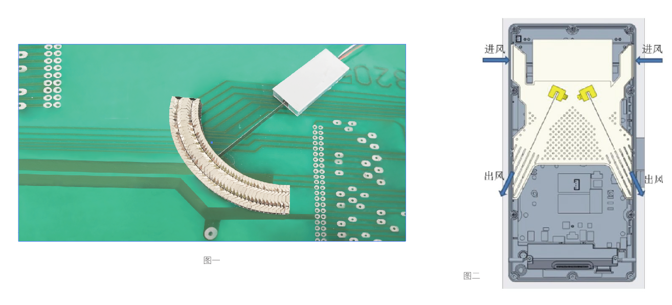 圖一:壓電平面風(fēng)扇采用單葉片設(shè)計(jì),結(jié)構(gòu)緊湊簡(jiǎn)單,風(fēng)扇開(kāi)啟后,關(guān)鍵器件溫度由80℃降至54℃。
